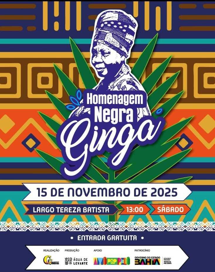 No dia 15 de novembro, o Largo Tereza Batista será palco da Homenagem à Negra Ginga, celebrando o legado de Aidil Moreira de Jesus, símbolo da cultura e resistência negra baiana. Com shows de Bambeia, Romilson Pretão | Partido Popular e Orisun Agbárà, o evento une samba, memória e gastronomia afro-baiana — e ainda vai ter feijoada da própria Ginga sendo vendida no local! 🍛 🗓️ 15 de novembro de 2025📍 Largo Tereza Batista – Pelourinho⏰ A partir das 13h🎟️ Entrada gratuita O projeto Homenagem à Negra Ginga é uma realização da Ginga Buffet e Eventos, Produção da Água de Levante Produções, com Apoio do Amô Pelo Pelô, CCPI e Patrocínio do Governo do Estado da Bahia. NegraGinga #HomenagemANegraGinga #Pelourinho #FeijoadaDaGinga #SambaDaBahia #CulturaAfroBaiana
