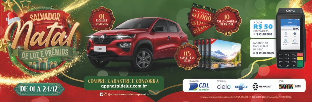 CDL Salvador lança campanha ‘Natal de Luz e Prêmios 2025’Consumidor concorre a um automóvel zero quilômetro, cinco televisores de 50 polegadas e dez vales-compra de R$ 1.000 cada um A CDL Salvador lança a campanha promocional “Salvador, Natal de Luz e Prêmios 2025”, para movimentar o comércio. Participam lojas de rua e shoppings de diferentes tamanhos na capital e Região Metropolitana. A ação distribuirá, via sorteio, prêmios como um automóvel Renault Kwid Zen 1.0, cinco televisores Smart de 50 polegadas e dez vales-compra de R$ 1.000 cada um. Para concorrer aos prêmios, os consumidores precisam realizar compras a partir de R$ 50, com qualquer meio de pagamento, em uma das lojas participantes, no período de 1º a 24 de dezembro. As compras processadas nas maquininhas Cielo garantem cupons em triplo. As notas são enviadas por meio do site oficial da promoção, appnataldeluz.com.br, acessível pelo celular. O site pede um cadastro simples com dados como nome, RG, CPF, telefone e endereço. Também é preciso responder à pergunta da promoção “Qual é a maior promoção de fim de ano de Salvador?”, cuja resposta correta é “Salvador, Natal de Luz e Prêmios”. O sorteio está agendado para o dia 8 de janeiro, às 11h, na sede da CDL Salvador, no bairro dos Aflitos. “A campanha integra o nosso calendário oficial de iniciativas de estímulo ao comércio e reafirma o compromisso da CDL Salvador com estratégias que fortalecem as empresas locais, valorizam o consumidor e tornam o período natalino ainda mais especial para todos os envolvidos”, afirma o presidente da CDL Salvador, Alberto Nunes. O superintendente da entidade, Silvio Corrêa, ressalta o impacto direto da promoção na aproximação entre consumidores e lojistas. “Estamos sempre buscando formas de aproximar o consumidor das lojas e de valorizar quem compra no comércio. Além dos prêmios, a campanha mobiliza centenas de estabelecimentos e cria um ambiente mais vibrante, competitivo e atrativo.” Coordenador da campanha, o economista Bernardo Carvalho explica o potencial gerado pela ação. “A cada edição, a campanha gera impacto direto especialmente no varejo físico. O valor inicial de participação é acessível a um grande número de pessoas, ampliando o fluxo de consumidores nas lojas. E os cupons em triplo para transações via Cielo impulsionam ainda mais a adesão.” O regulamento completo da campanha promocional está disponível no site www.cdl.com.br, endereço onde o público poderá acompanhar o sorteio e a divulgação dos contemplados. SERVIÇOO quê: campanha promocional “Salvador Natal de Luz e Prêmios 2025”Quando: 1º a 24 de dezembro de 2025Onde: Salvador e Região MetropolitanaRealização: CDL SalvadorMais informações: www.cdl.com.br