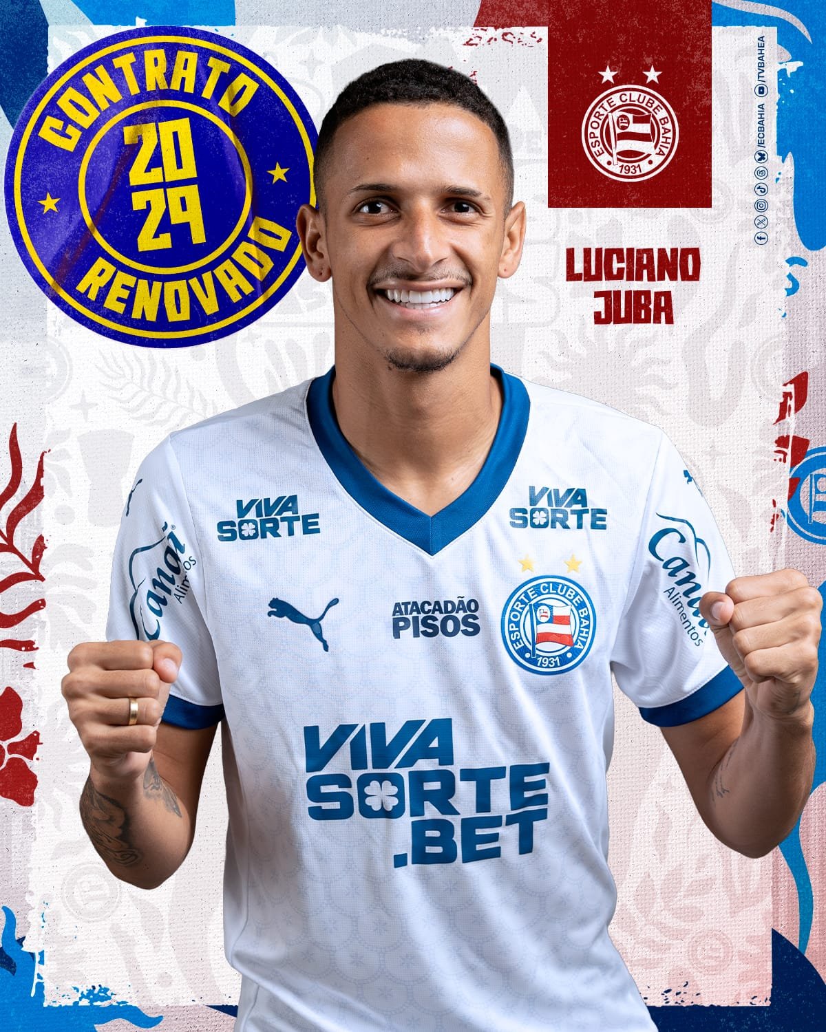 O Esporte Clube Bahia SAF, anunciou a renovação de contrato do lateral Luciano Juba. O atleta conta com extensão do vínculo com o Esquadrão até 2029. Juba chegou ao Bahia em setembro de 2023. Ao todo, o lateral vestiu a camisa do Tricolor 141 vezes, marcou 11 gols e deu 16 assistências. Em 2025, Juba foi o vice-artilheiro do Bahia no Campeonato Brasileiro, com seis gols. As boas atuações renderam a primeira convocação do lateral para a Seleção Brasileira. Também nesta temporada, Juba foi campeão baiano e da Copa do Nordeste pelo Bahia.