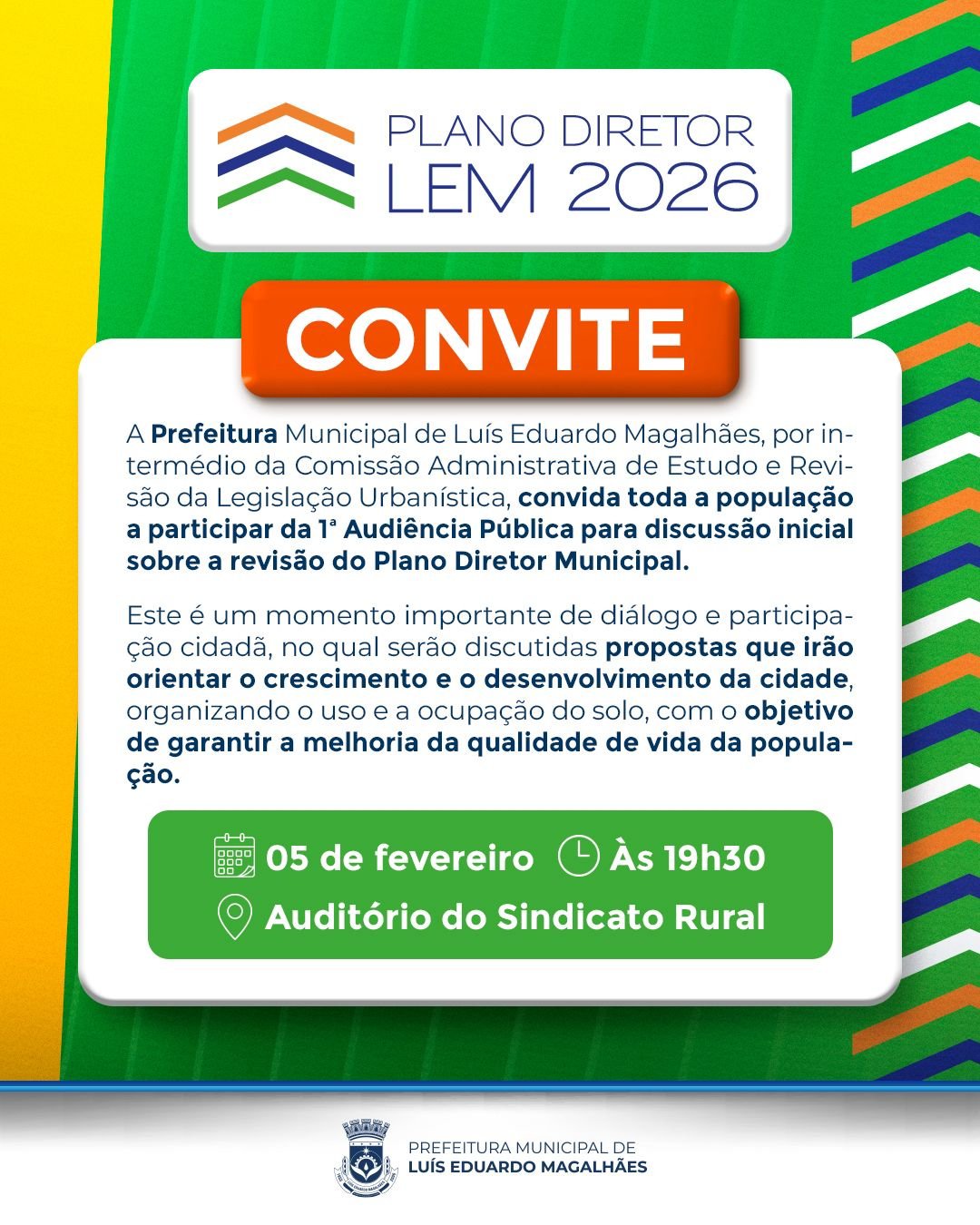 O encontro marca o início das discussões sobre o futuro da cidade. É um momento de diálogo, escuta e participação cidadã. Durante a audiência, serão debatidas propostas que irão orientar o crescimento e o desenvolvimento do município. Entre os temas estão o uso e a ocupação do solo, sempre com foco na melhoria da qualidade de vida da população. A participação da comunidade é fundamental para garantir transparência e construção coletiva das decisões. A Procuradora-Geral do Município e integrante da Comissão, Élese Mendes, destaca a importância do momento: “A audiência pública é uma etapa essencial da revisão do Plano Diretor. É quando a população pode participar ativamente, contribuindo com ideias e sugestões que vão ajudar a organizar o crescimento urbano de forma legal, transparente e democrática.” A audiência é aberta a todos. Participe e ajude a construir os caminhos para o futuro de Luís Eduardo Magalhães. Serviço: Data: 05 de fevereiro (quinta-feira) Local: Auditório do Sindicato dos Produtores Rurais Horário: 19h30