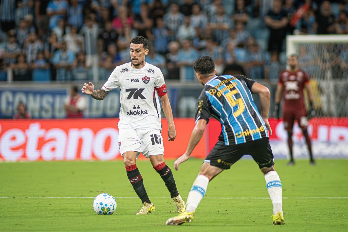 O Esporte Clube Vitória foi superado por 2 a 0 pelo Grêmio Foot-Ball Porto Alegrense, na noite desta quinta-feira (19), na Arena do Grêmio, em confronto válido pela sétima rodada do Campeonato Brasileiro Série A. No primeiro compromisso fora de Salvador após 40 dias, o Vitória encontrou muitas dificuldades diante de um adversário que controlou a partida desde os minutos iniciais e construiu o resultado com autoridade. O Grêmio teve maior posse de bola e presença ofensiva, principalmente explorando o lado direito, enquanto o time baiano enfrentou problemas na transição e só conseguiu finalizar pela primeira vez aos 40 minutos do primeiro tempo. O placar foi aberto aos 26 minutos, em um lance dentro da área: após cruzamento rasteiro, o zagueiro Camutanga tentou cortar, mas acabou marcando contra, colocando os donos da casa em vantagem. Na etapa final, o cenário pouco mudou. Logo aos oito minutos, o Grêmio ampliou com Amuzu, que aproveitou um lançamento longo, avançou livre e finalizou na saída do goleiro Lucas Arcanjo. O técnico Jair Ventura promoveu alterações na equipe na tentativa de reação, mas o Vitória teve dificuldades para criar oportunidades claras e pouco ameaçou o gol adversário. O momento mais dramático da partida aconteceu no segundo tempo, quando o lateral Marlon, do Grêmio, sofreu uma grave lesão após uma dividida. O jogador deixou o campo de ambulância, sob forte comoção de atletas e torcedores. Após o ocorrido, o Vitória utilizou as redes sociais para prestar solidariedade ao atleta, em um gesto que marcou o fim de uma noite difícil dentro e fora de campo.