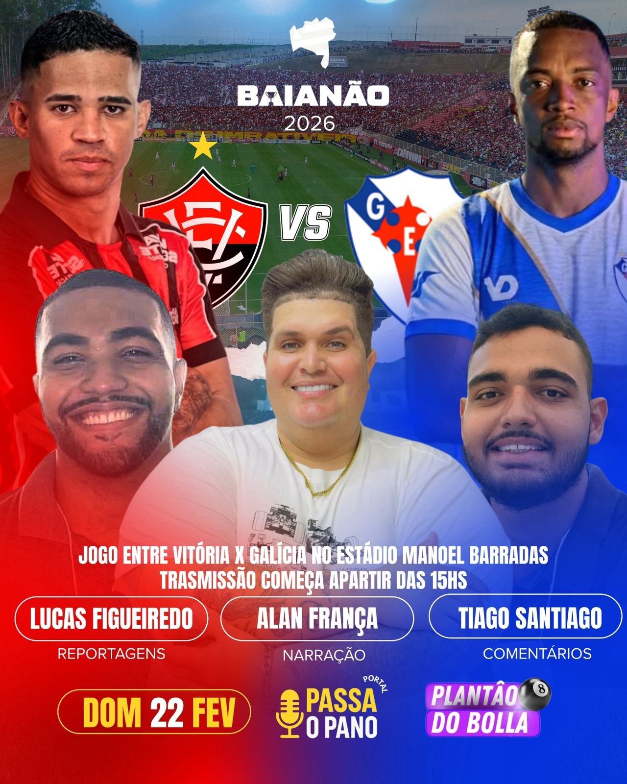 O confronto imperdível entre Vitória e Galícia, no Campeonato Baiano de 2026, que vai rolar no Estádio Manoel Barradas. O clássico promete fortes emoções, com uma equipe de transmissão experiente levando todas as ações do jogo ao vivo para os torcedores.