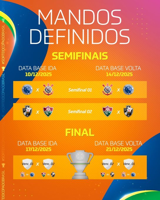 Além disso, foi definido o mando de campo da decisão da competição. Quem avançar entre Cruzeiro e Corinthians disputa o primeiro jogo da final em casa, com fluminense ou Vasco tendo o mando do confronto de volta.
