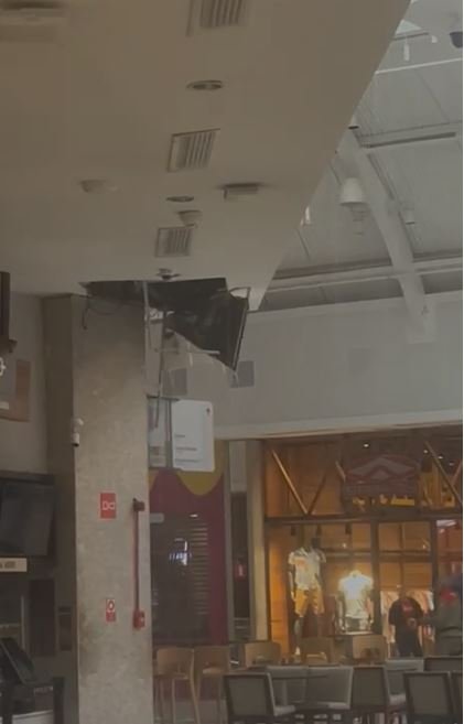 Vídeos enviados ao portal passaopano mostram o momento em que a estrutura cede e desaba no interior do shopping. Apesar do susto, não houve registro de feridos. Mas foi antes da abertura do shopping.