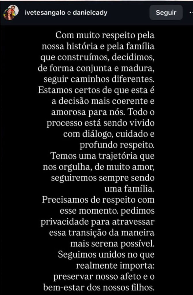 Na nota publicada, ambos pediram respeito à decisão e solicitaram discrição neste momento delicado, destacando que a prioridade continua sendo o bem-estar dos filhos e a preservação da família, mesmo com o encerramento do relacionamento conjugal.