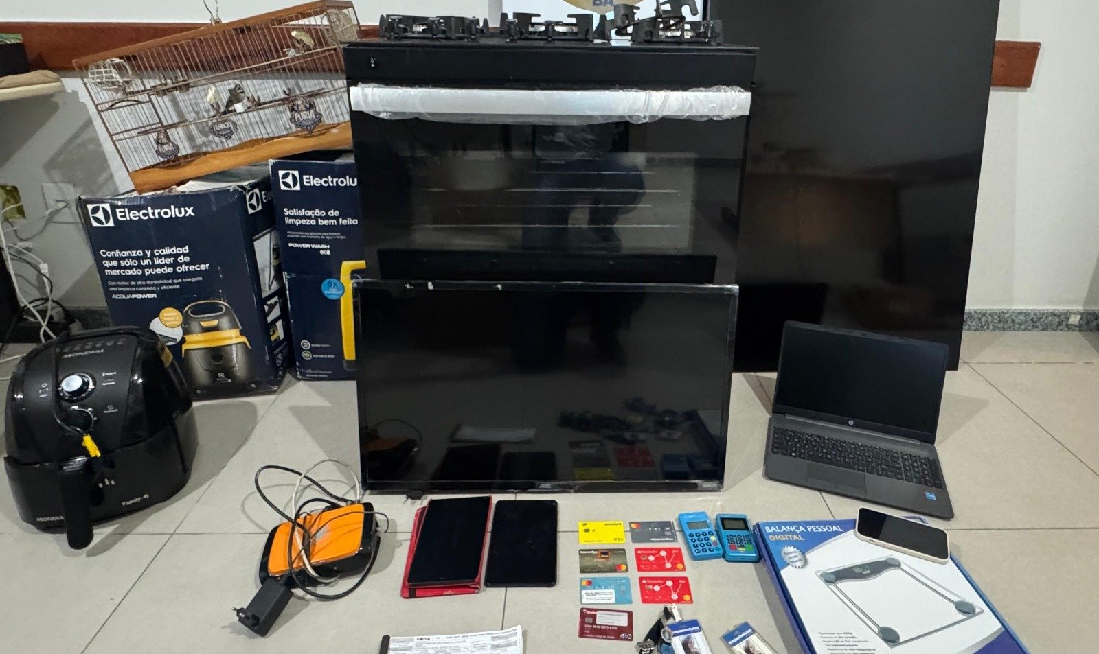 No cumprimento de mandado de busca na residência da investigada, foram apreendidos notebook, iPhone, tablet, fogão, televisores e outros bens sem comprovação de origem, suspeitos de terem sido adquiridos com recursos das fraudes.